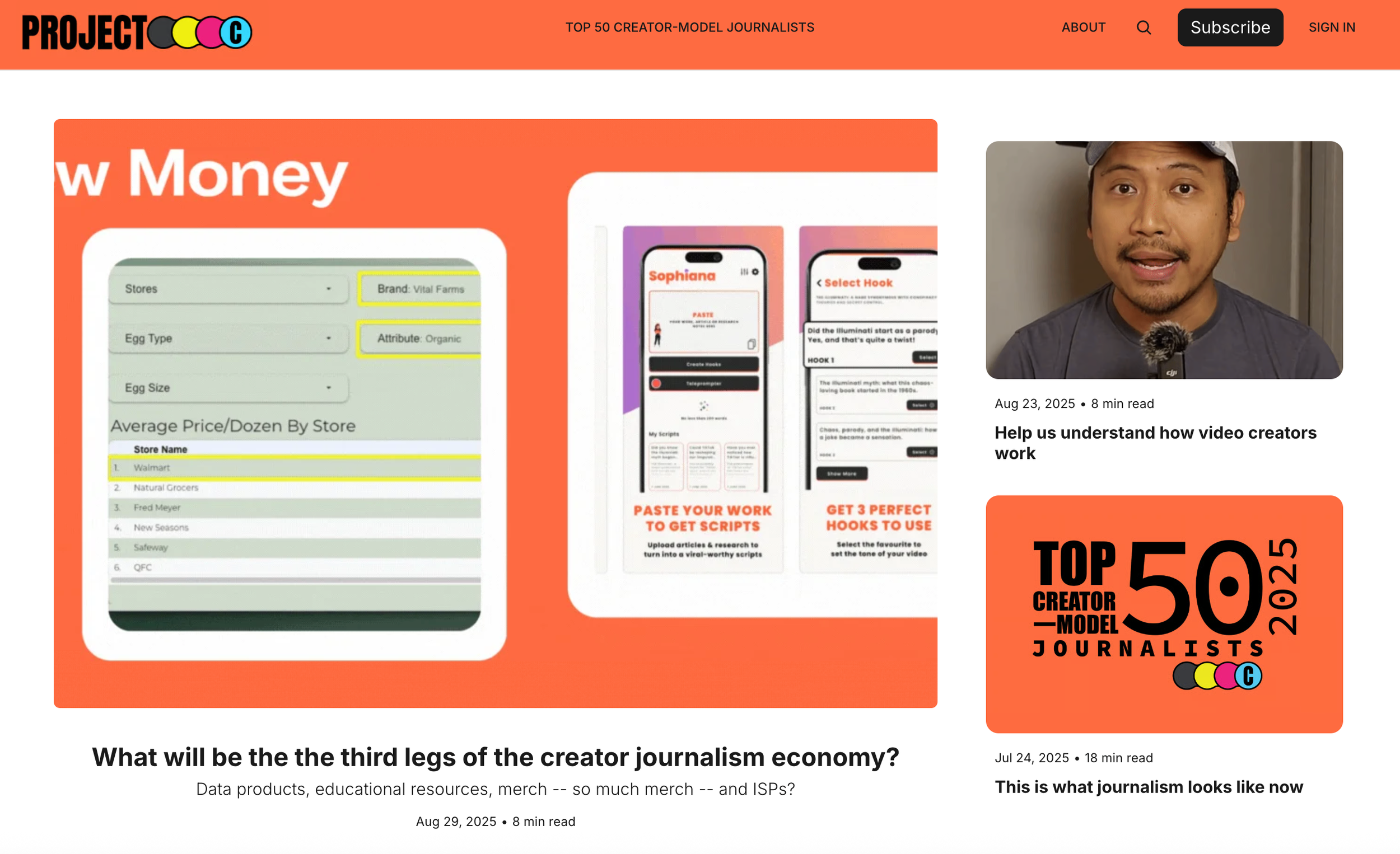 Whether you're a journalist considering a solo path, an established creator looking to grow or someone invested in the future of independent media, Project C is here to help. Subscribe to the newsletter, take a course, join the community or follow along as we explore what’s next for journalism in the creator economy.